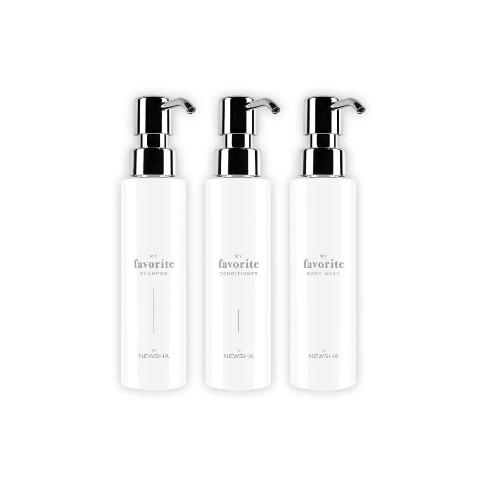 Das Luxus Refill Bestseller Set No.6 bietet eine hochwertige Refill-Lösung für Shampoo, Conditioner und Body Wash. Drei langlebige Nachfüll-Flaschen mit verchromtem Pumpspender und minimalistischer Wandhalterung bringen Funktionalität und Design in Einklang – ganz ohne Bohren, ganz ohne Rückstände. Die Flaschen lassen sich mit jedem beliebigen NEWSHA Produkt befüllen und fügen sich durch ihr elegantes, weißes Design nahtlos in jedes Badezimmer ein.