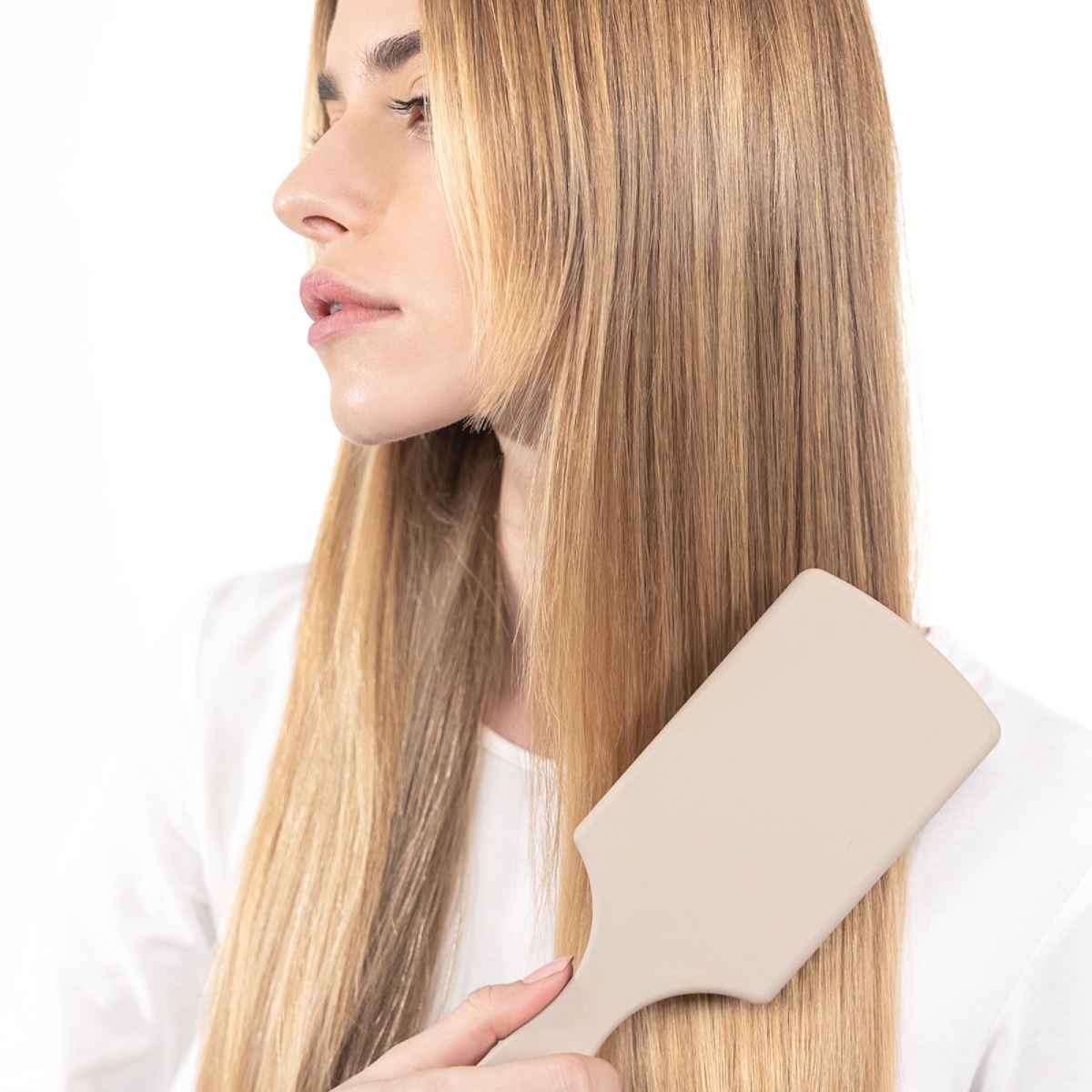 - Für ein seidiges Ergebnis die Haare mit einer Paddle- oder Rundbürste gleichmäßig trocknen.