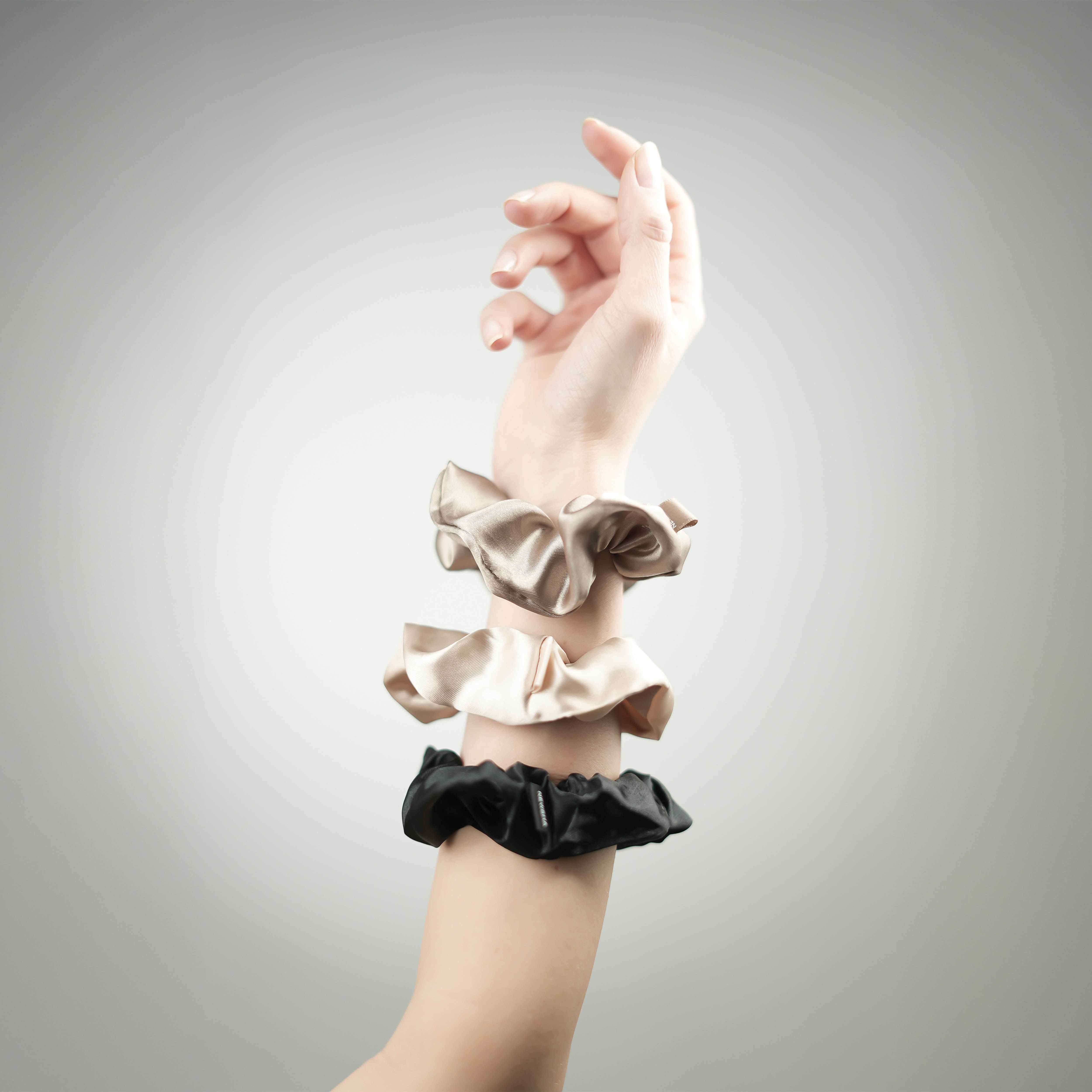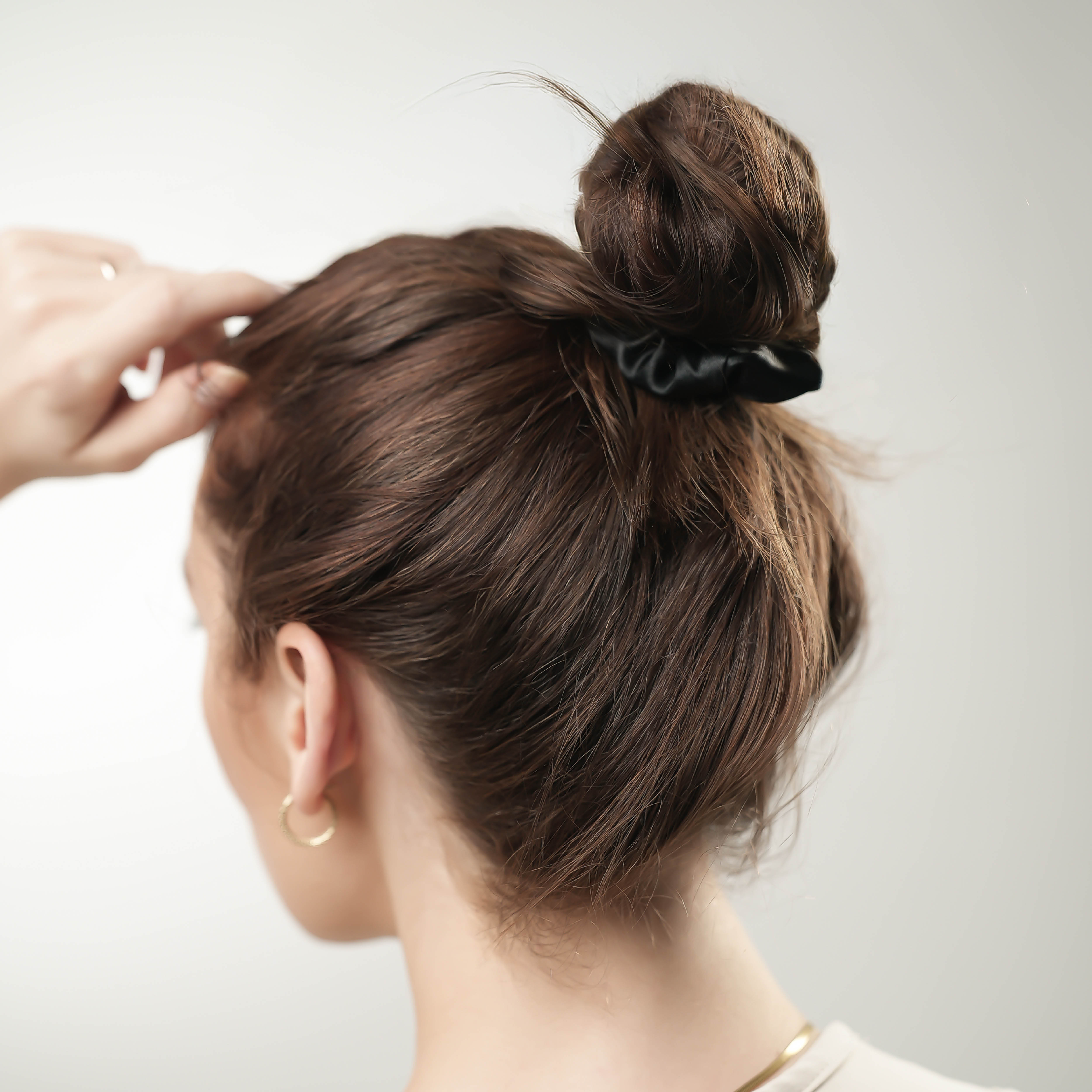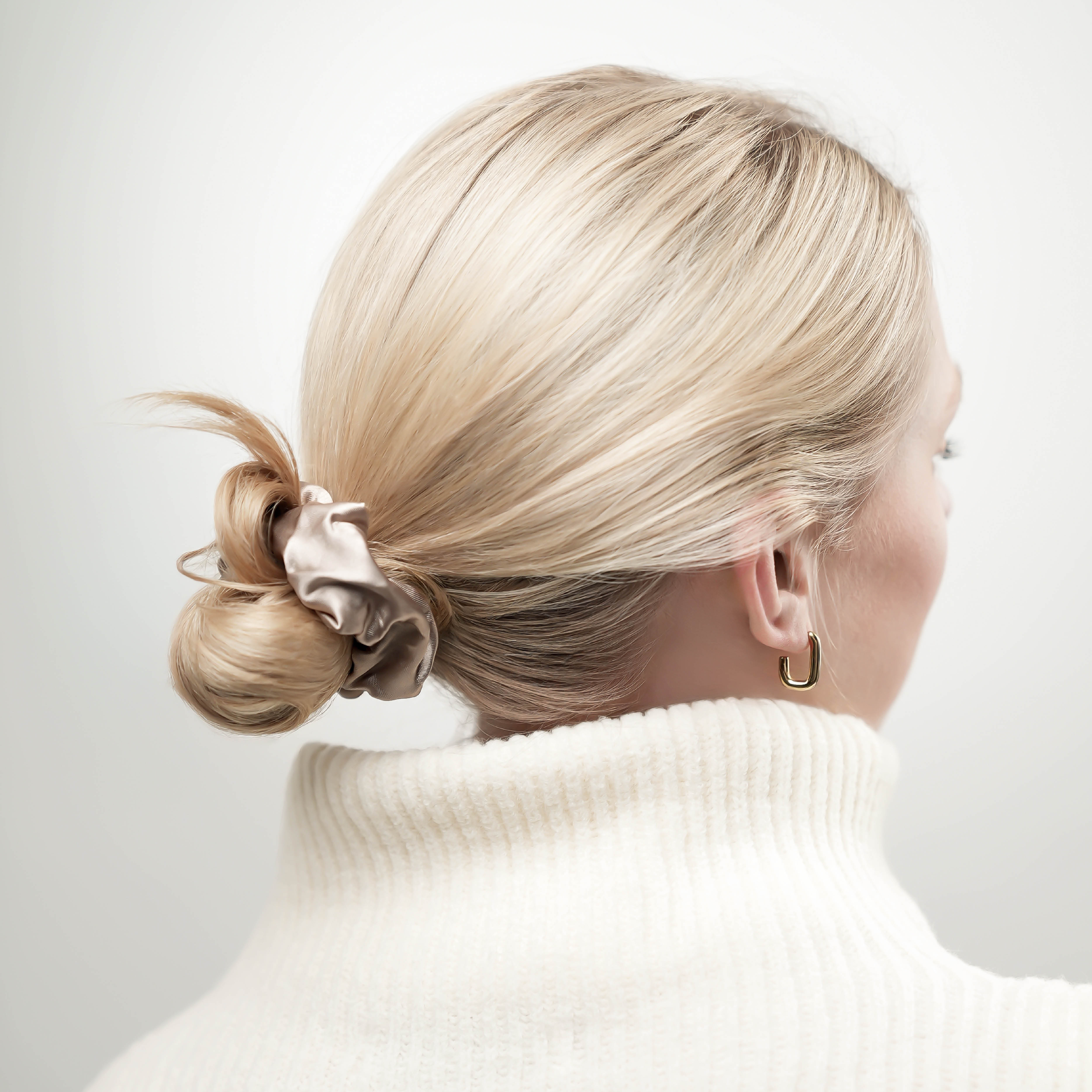 Nicht nur seidige Kissen tun uns in der Nacht wohl – auch Scrunchies aus Satin oder Seide sind Helfer, die dein sensibles Haar im Schlaf schützen. Der glatte Stoff verursacht weniger Reibung als andere Materialien. Dies führt zu weniger Frizz.